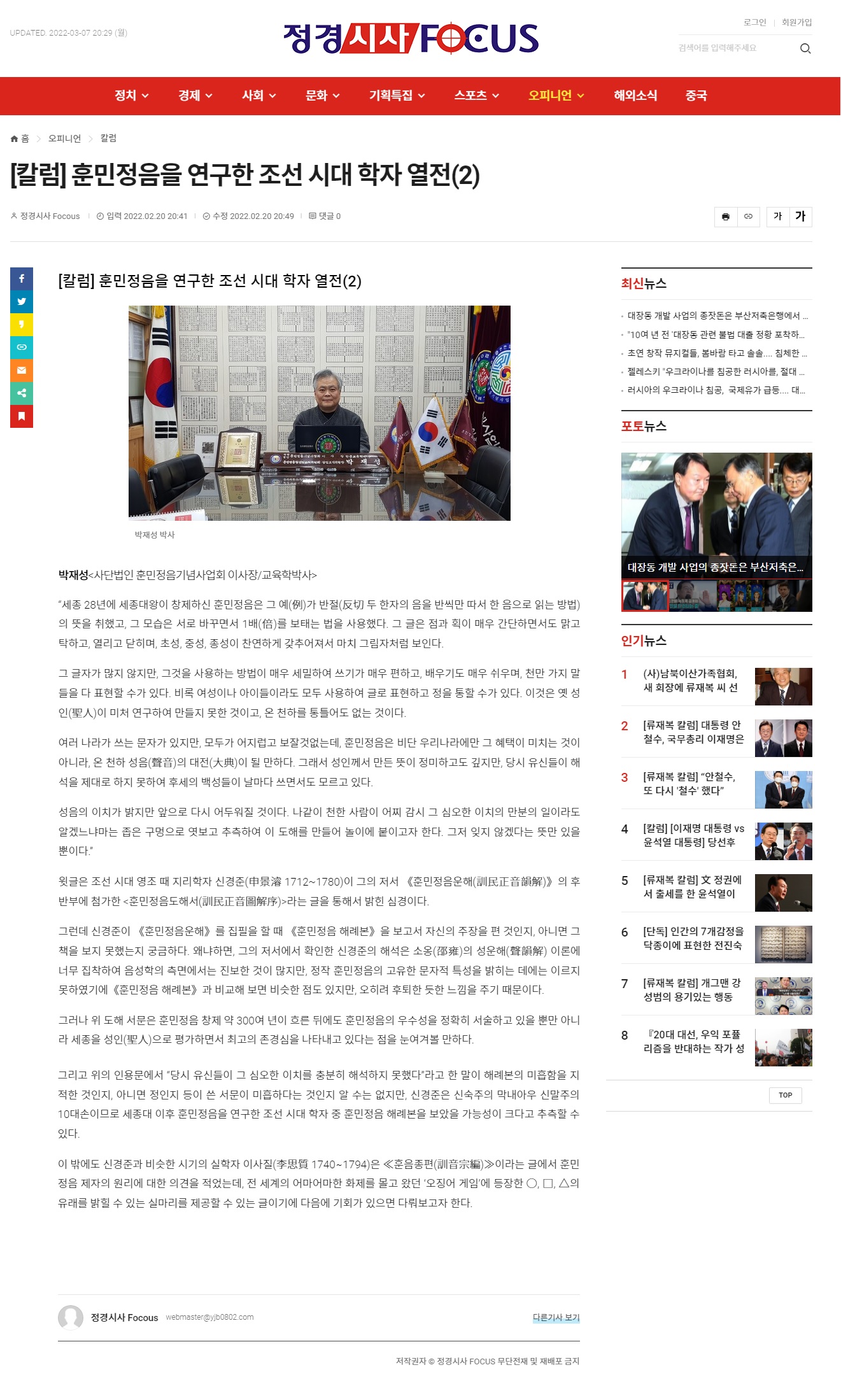 [칼럼] 훈민정음을 연구한 조선 시대 학자 열전(2) < 칼럼 < 오피니언 < 기사본문 - 정경시사 FOCUS (yjb0802.com)
