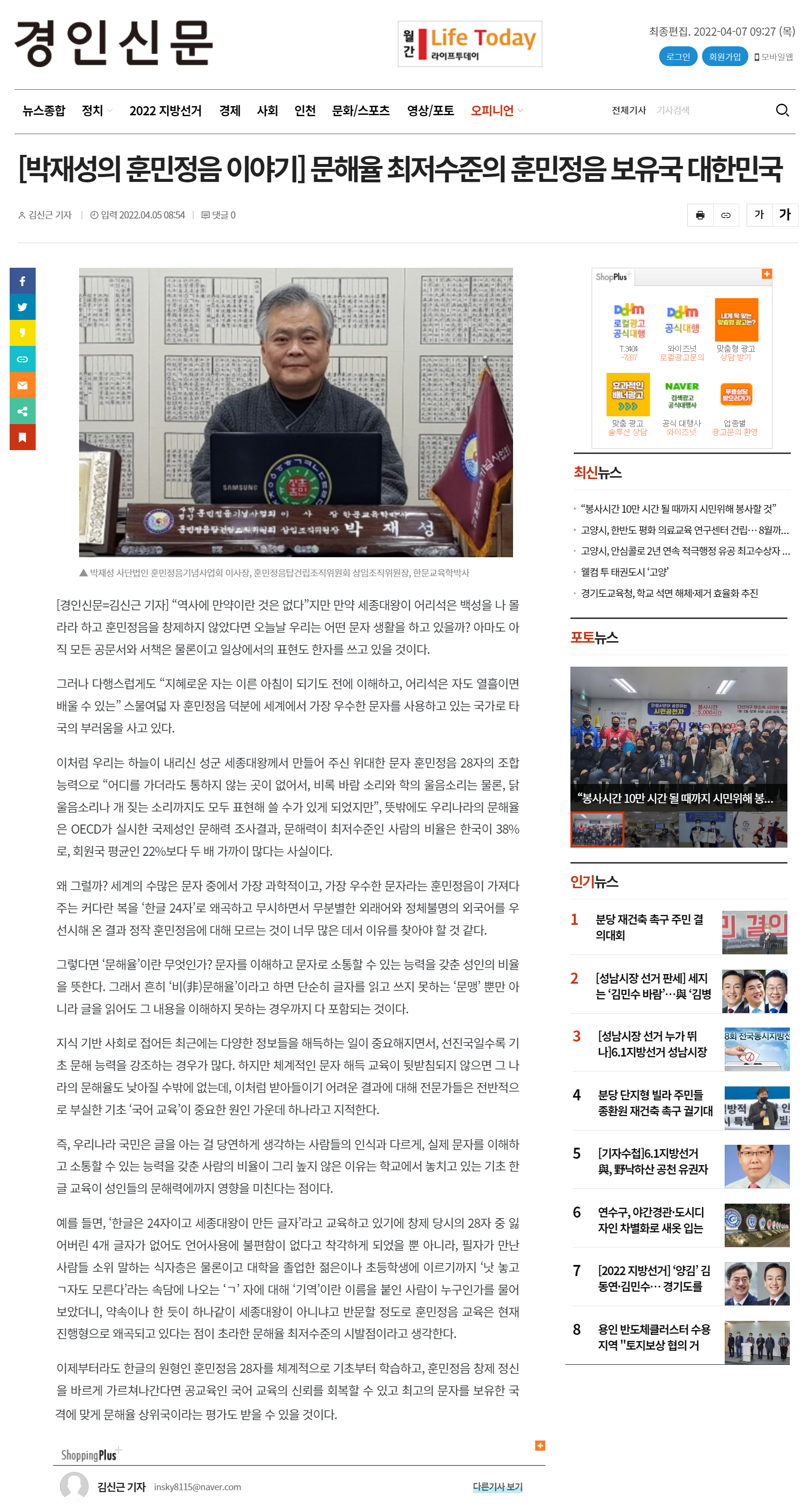 [경인신문] 문해율 최저수준의 훈민정음 보유국 대한민국