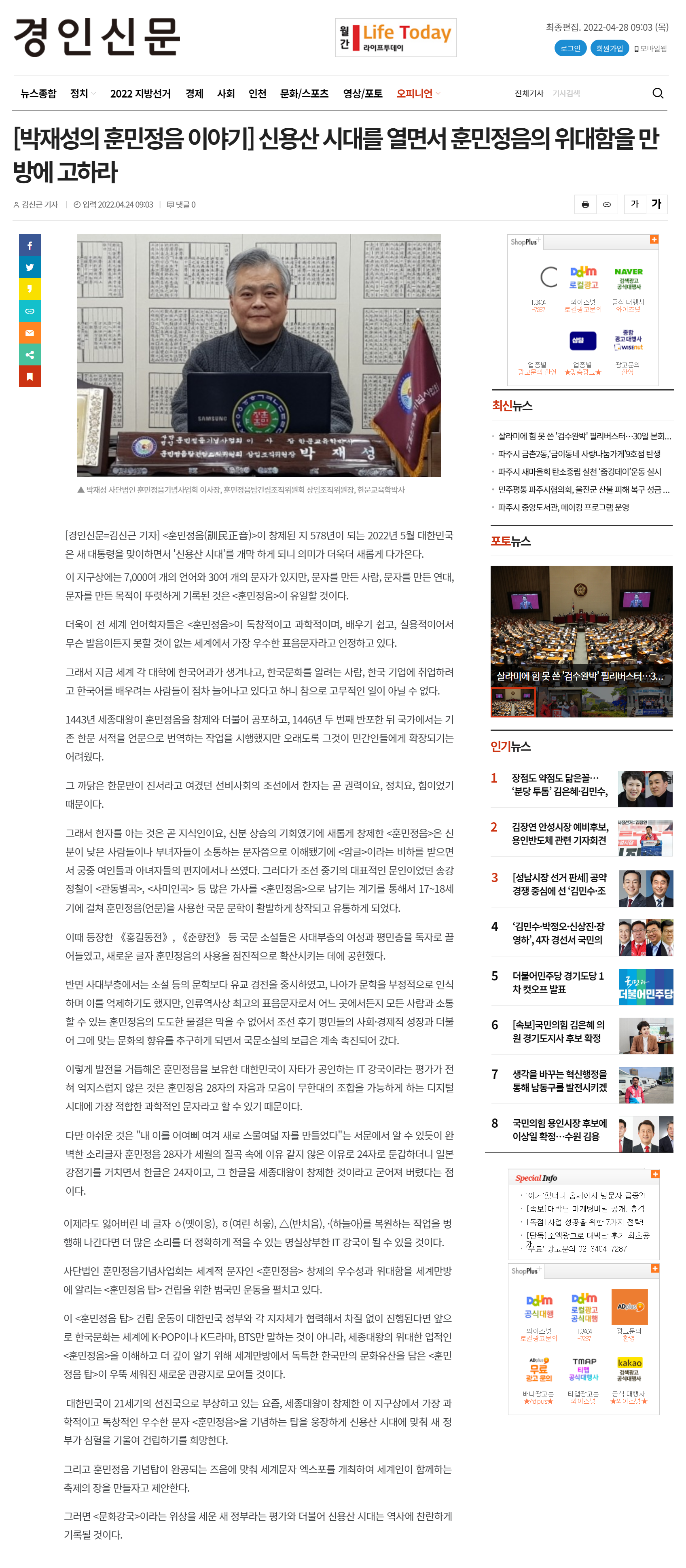 [경인신문] 신용산 시대를 열면서 훈민정음의 위대함을 만방에 고하라
