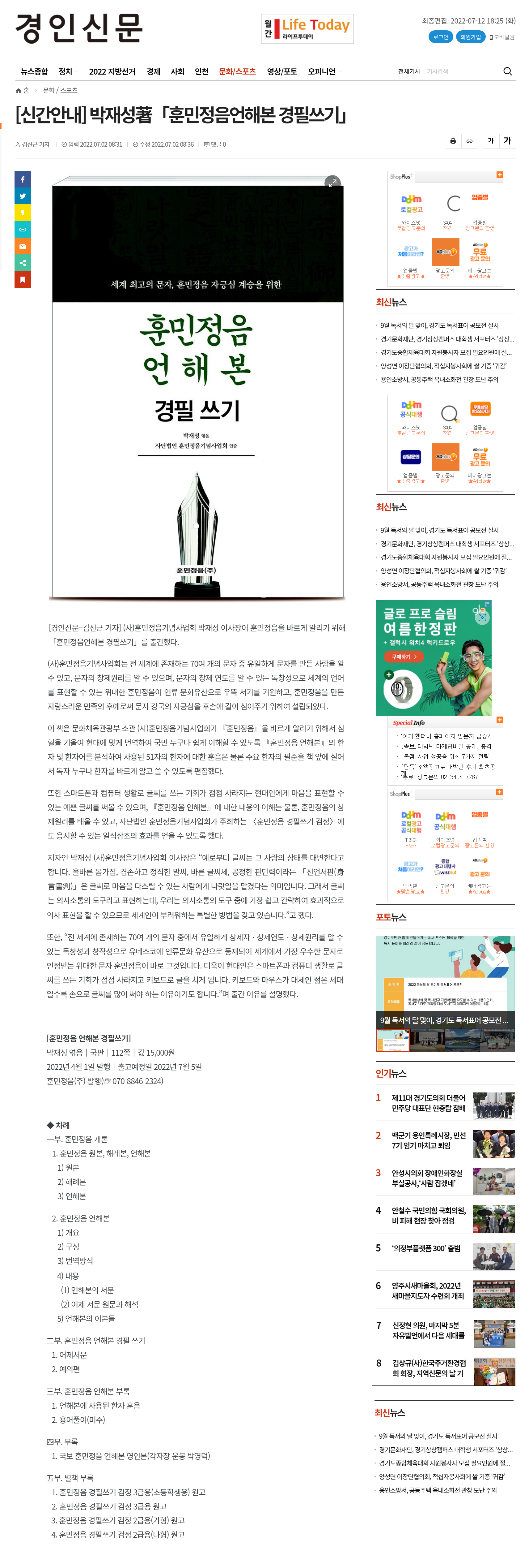 [경인신문] 훈민정음 해례본 경필쓰기 도서 출간