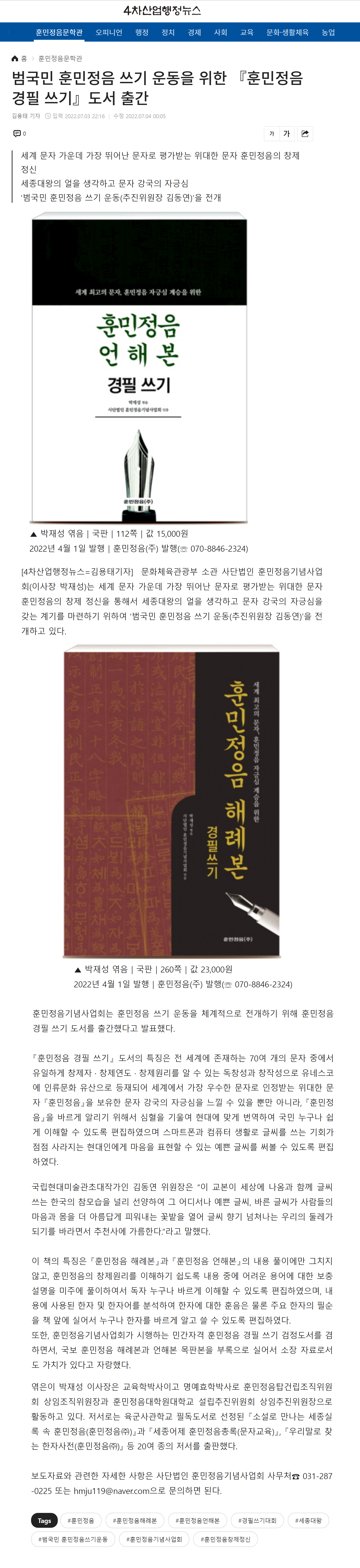 [4차산업행정뉴스] 훈민정음경필쓰기 도서 출간