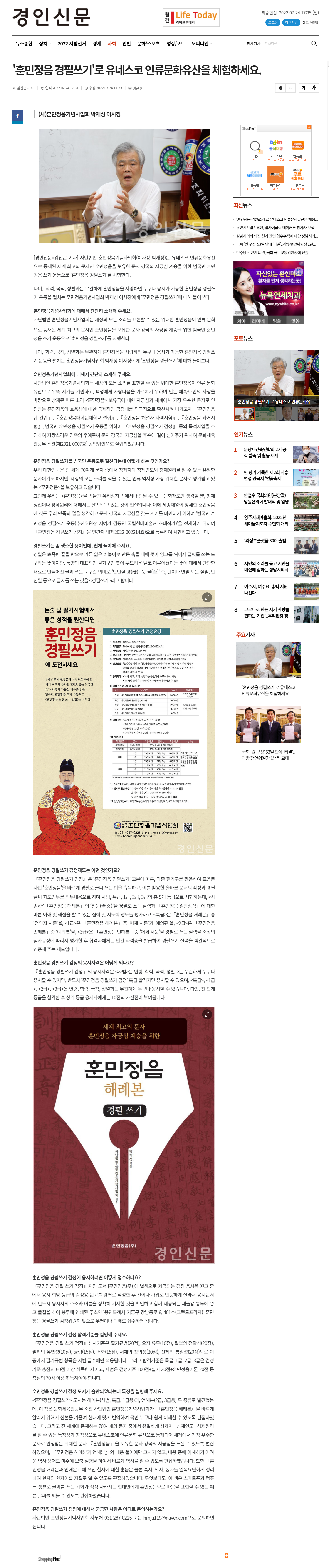 [경인신문] '훈민정음 경필쓰기'로 유네스코 인류문화유산을 체험하세요