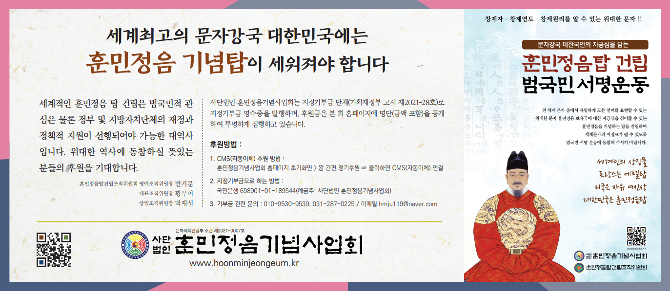 훈민정음탑 건립기금 모금 5단 광고
