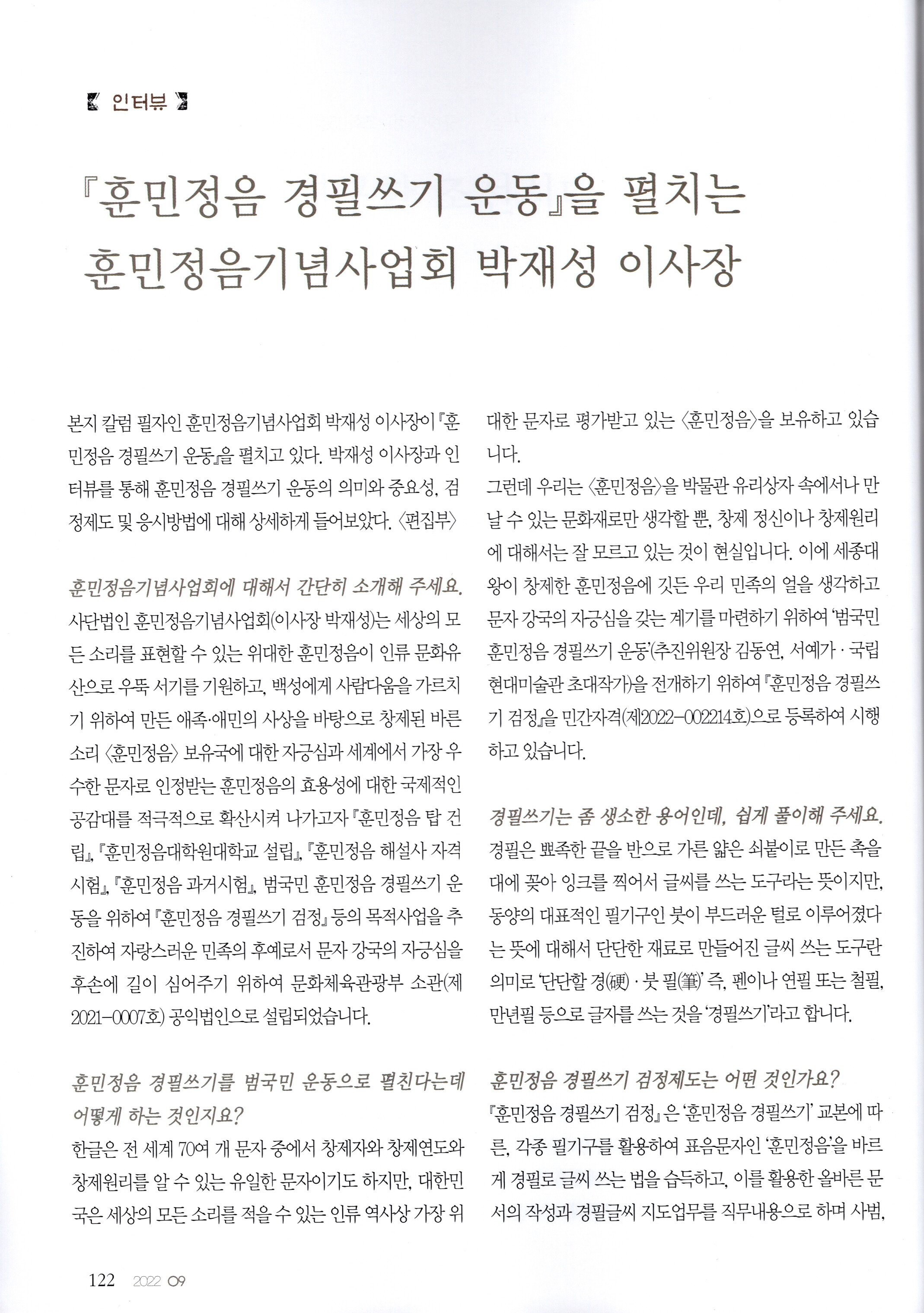 [월간서예문인화]훈민정음 경필쓰기 운동을 펼치는 박재성 이사장 인텨뷰
