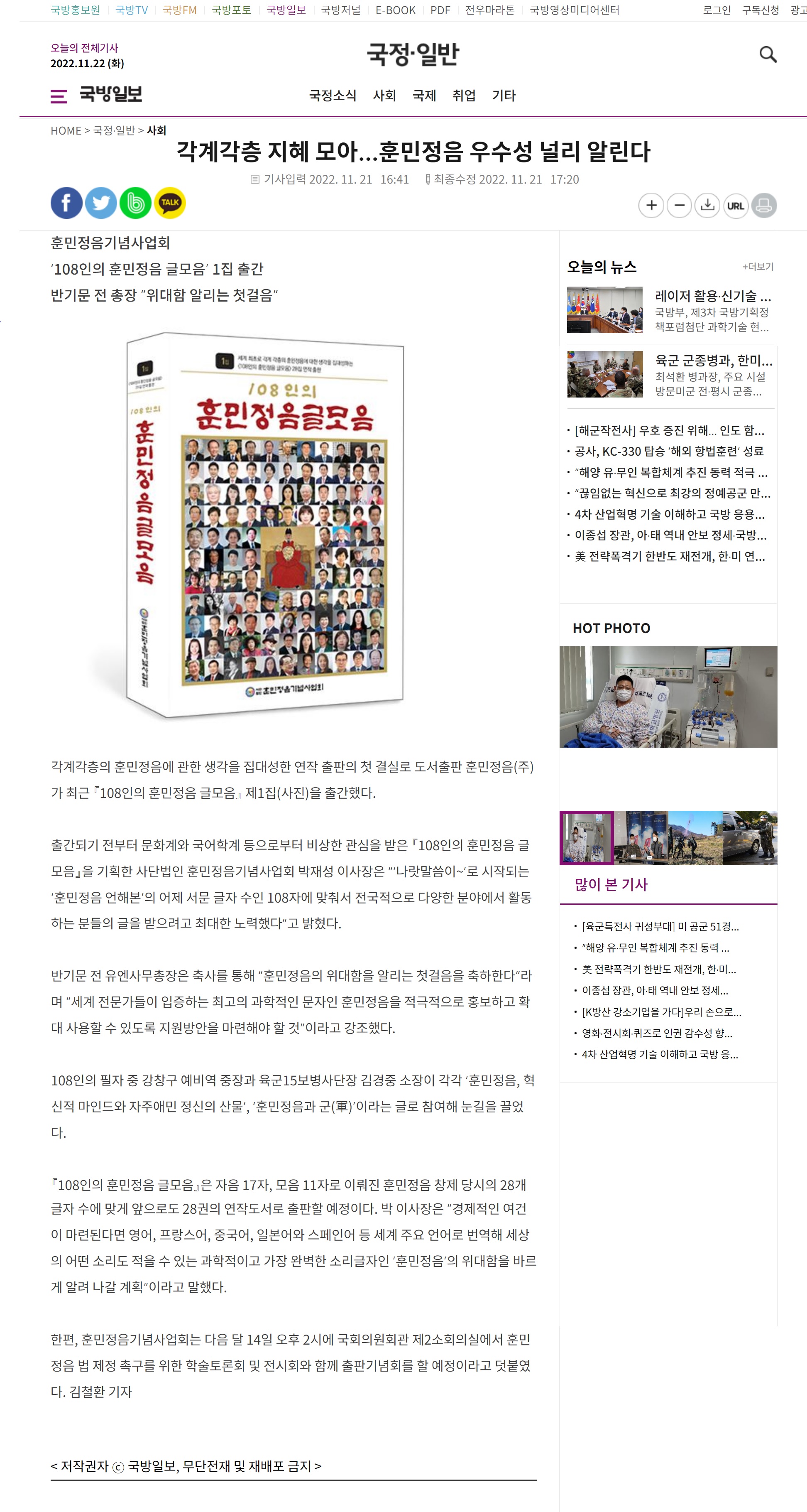 [국방일보]108인의 훈민정음 글모음 1집 출간