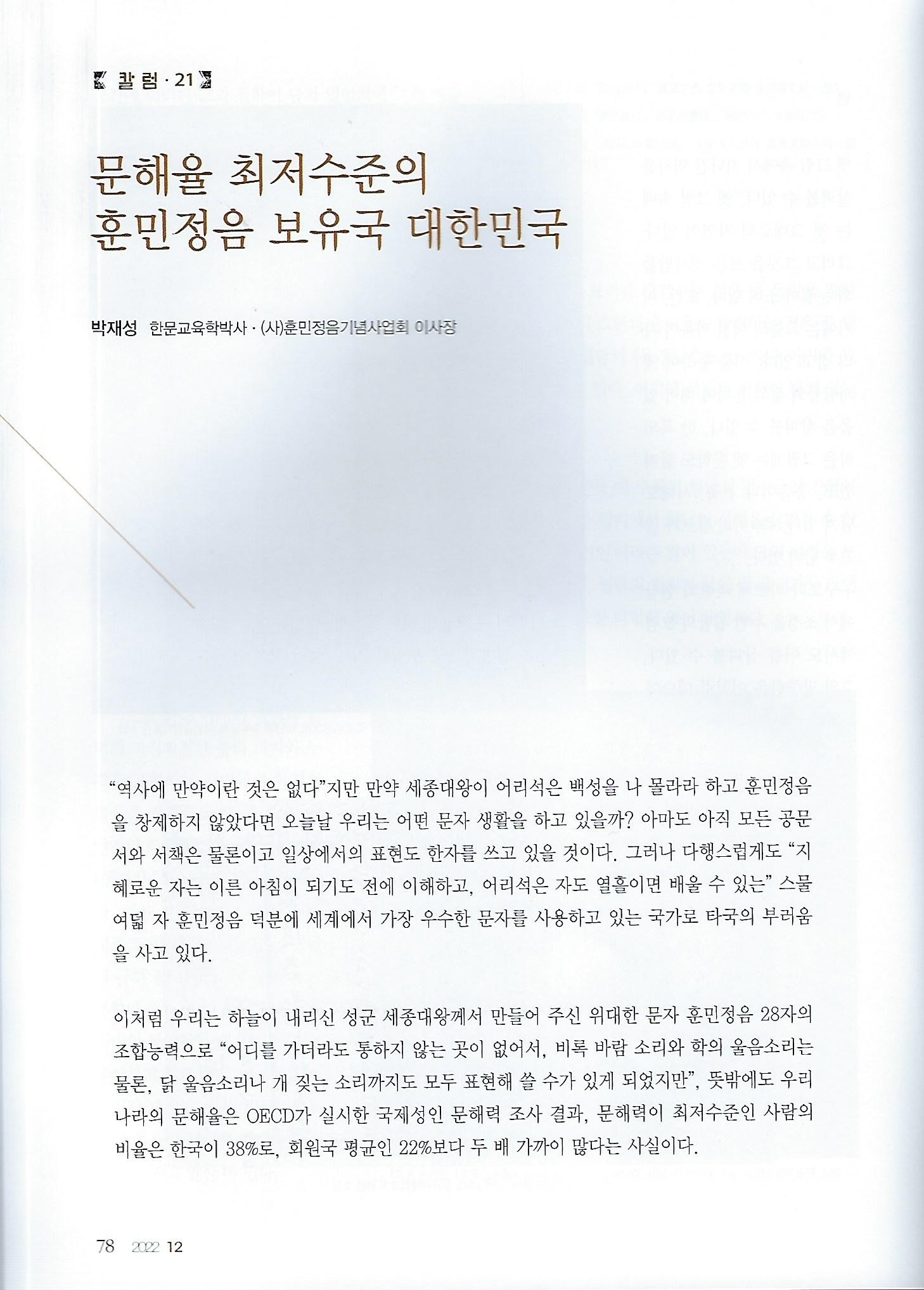 [월간서예문인화] 문해율 최저수준의 훈민정음 보유국 대한민국