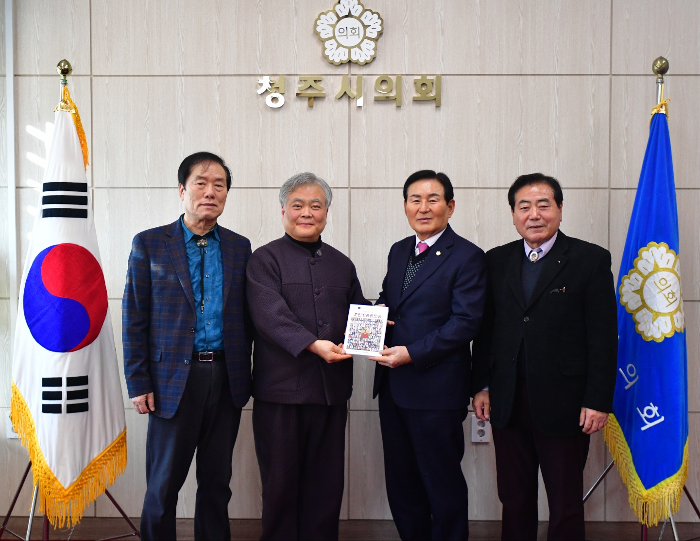 사단법인 훈민정음기념사업회 박재성 이사장은 김동연 충북지회장, 이동주 청주시 지부장과 함께 2023년 1월 27일(금) 오후 3시 청주시 의회 김병국 의장을 예방하고 청주시 초정 세종 행궁 활용 방안 등에 관해 대화를 나눴다. 이 자리에서 박재성 이사장은 김병국 의장에게 <108인의 훈민정음 글모음>에 옥고를 주시어서 책이 한층 돋보이게 되어 감사하다는 뜻을 표한 후 도서 5권과 훈민정음 달력을 증정하였다.