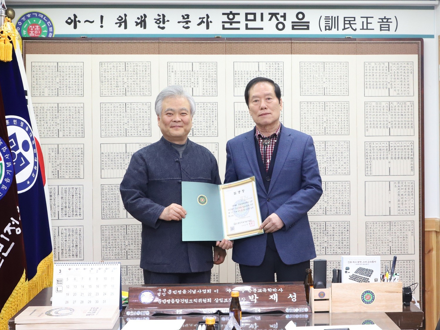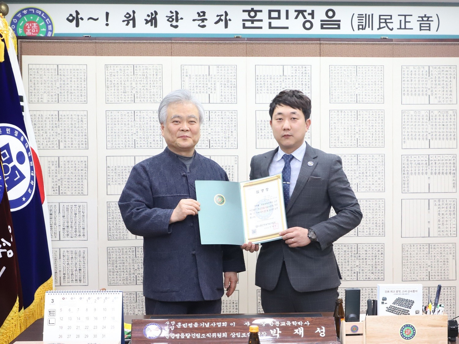 2023년 3월 28일(화) 오후 2시 사단법인 훈민정음기념사업회 박재성 이사장은 지난 임시총회에서 선출된 신임 이사와 감사에게 임명장을 수여하고 훈민정음기념사업회 발전을 위해 헌신해 줄 것을 당부하였다. 사진 좌로부터 김현욱 감사(용인경제발전협의회 대표) 김동연 이사(사단법인 세계문자서예협회 이사장) 박재성 이사장, 이상식 이사(전 부산지방경찰청 청장) 이금로 감사(전 국민은행 지점장)