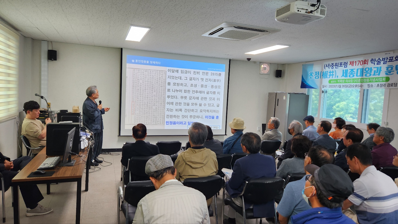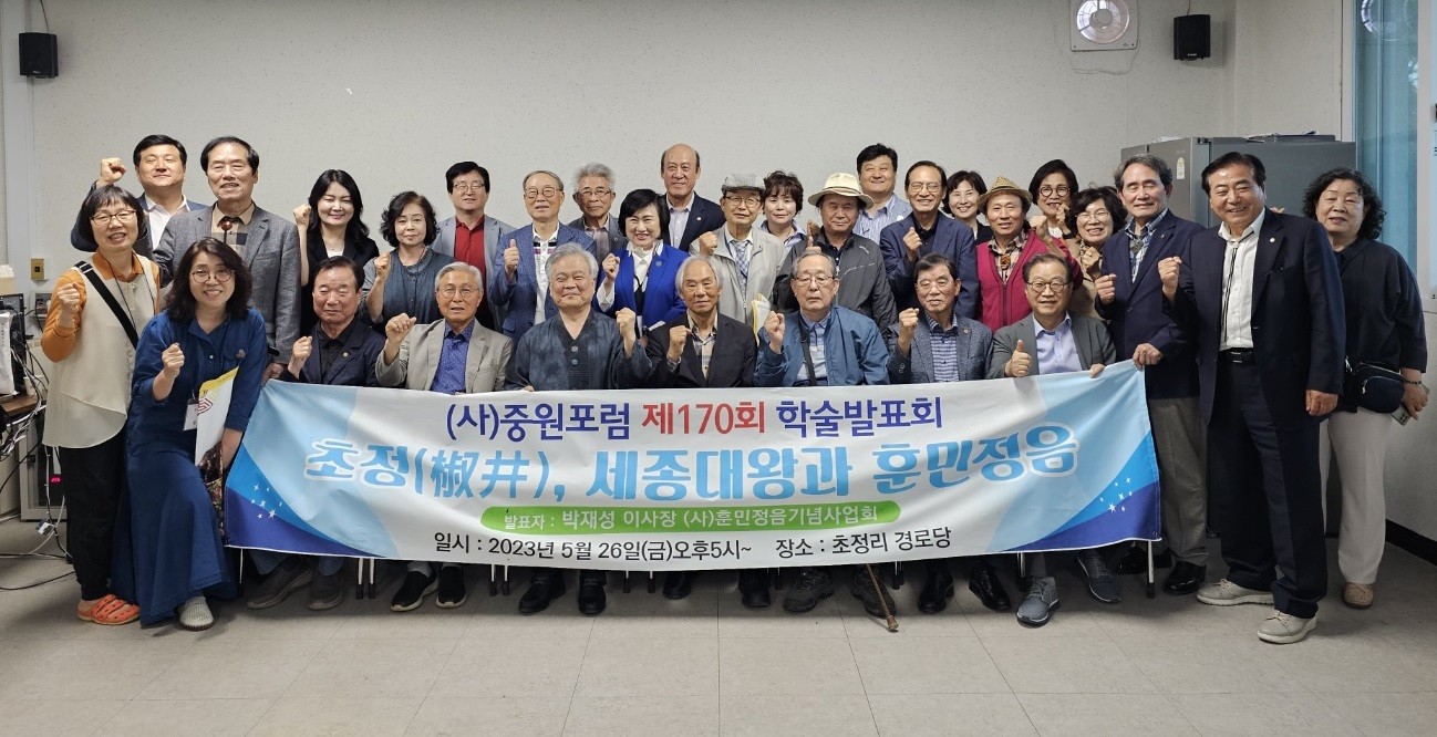 박연석 전) 청주시의회 의장이 회장으로 있는 (사)중원포럼 제170회 학술발표회가 5월 26일(금) 충북 청주시 청원구 내수읍 초정리 경로당에서 개최되었다. 참석자들은 사전 행궁현장을 둘러보고 당시를 회상하는 시간을 갖었으며 지역의 전문가와 청주시 관계관 및 의회 의원, 훈정회원과 지역주민 등 약 60여 명이 참석했다. 이날 발표회에서 사단법인 훈민정음기념사업회 박재성 이사장은「초정(椒井), 세종대왕과 훈민정음」 주제 발표를 통해서, 1444년 봄, 가을 2차례에 걸쳐 초정에 거둥한 세종대왕은 안질을 치료하기 위함이라는 표면적 이유보다도 당시 속리산 복천암에서 불도를 닦고 있던 신미대사와의 만남을 통한 훈민정음 창제 작업의 마무리를 위한 비밀스러운 여행(?) 목적이었다는 내용을 세종실록을 근거로 새로운 사실을 밝히는 계기가 되었으며실제 훈민정음의 탄생지임을 강조하였다. 이날 학술발표회는 충북지역의 각계 인사들이 참여하여 초정 행궁일원의 역사ㆍ문화적 사료와 가치를 재조명하고 세종대왕과 훈민정음, 초정약수 등 세계적 자원을 활용하여 관광 명소화를 모색하기 위해 마련되었다. <이동주 전) 사무총장>