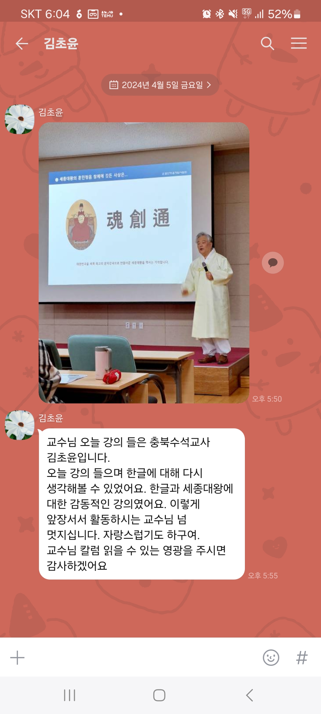 사단법인 훈민정음기념사업회 이사장 박재성 교육학박사는 충북 청주시 상당구 가덕면 교육원로 153-100에 위치한 단재교육연수원(본원)에서 실시된 2024. 유초등 수석교사 역량강화 직무연수에 특별강사로 초빙되어 '훈민정음과 한글'이라는 주제로 2024년 4월 5일(금) 오후 2시30분부터 4시20분까지 유초등 수석교사 55명을 대상으로 특강을 하였다. 세종실록을 근거로 훈민정음의 오해와 진실에 대해서 강의를 진행하면서 훈민정음기념탑 건립의 필요성에 대하여 역사적 사실(史實)을 바탕으로 역설하여 참석한 교사들로부터 뜨거운 호응을 받았다. 이날 박 이사장은 수강생 전원에게 특허받은 '2024년 훈민정음 달력'을 증정하여 훈민정음기념사업회를 알리는 것도 잊지 않았다.