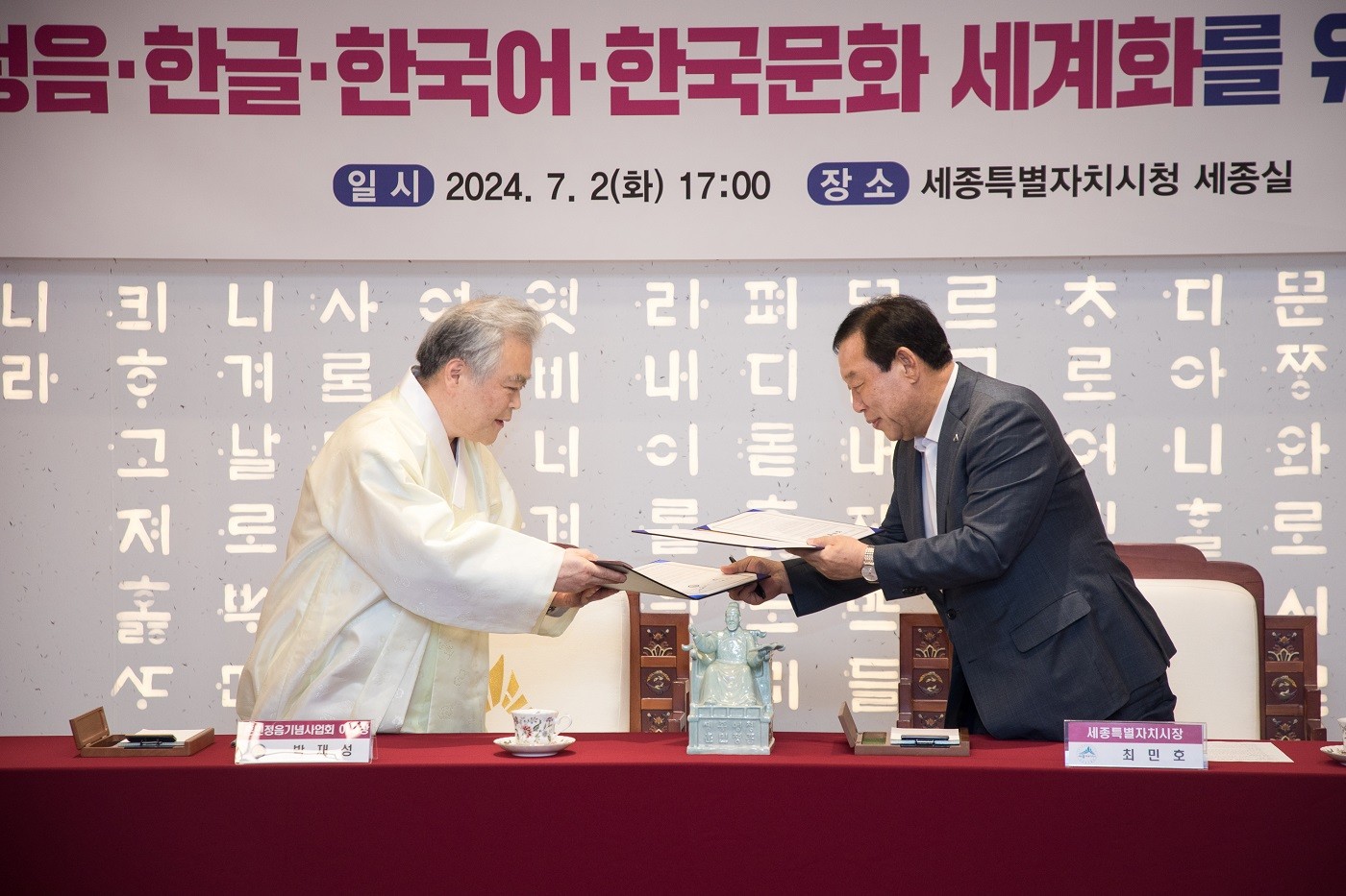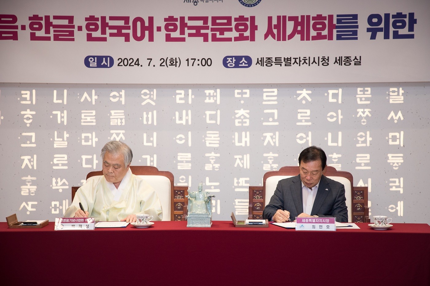 사단법인 훈민정음기념사업회(이사장 박재성. 이하 ‘훈정회’)는 7월 2일 오후 5시 세종특별자치시 집현실에서 세종특별자치시(시장 최민호. 이하 ‘세종시’)와 훈민정음·한글·한국어·한국문화 세계화를 위한 업무협약을 체결했다.