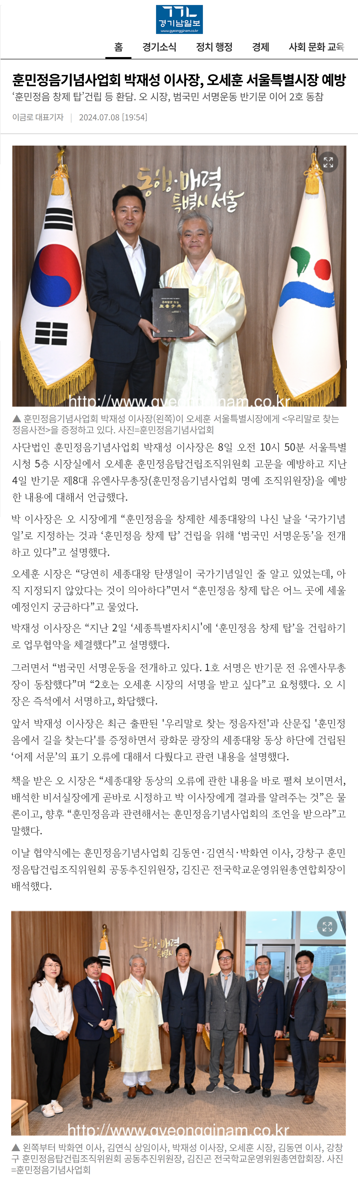 [훈민정음신문] 오세훈 서울시장 방문해 훈민정음창제탑 건립 등 환담