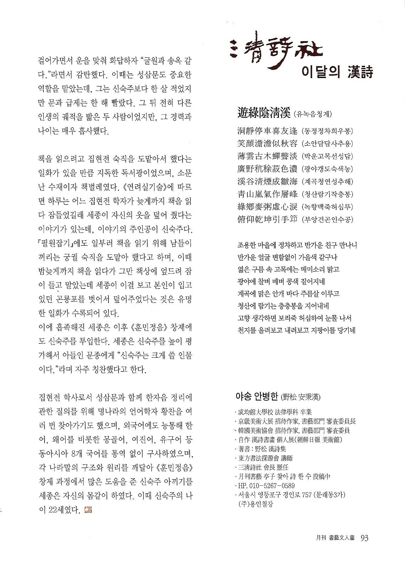 [월간서예문인화] 훈민정음 창제 과정의 네 번째 조력자 신숙주