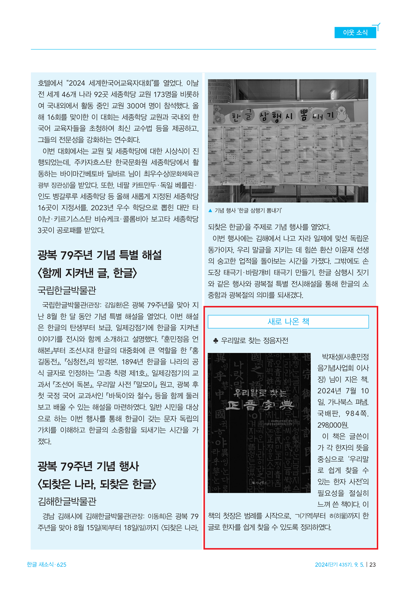<한글새소식>9월호(한글학회 발행)에 [우리말로 찾는 정음자전] 소개