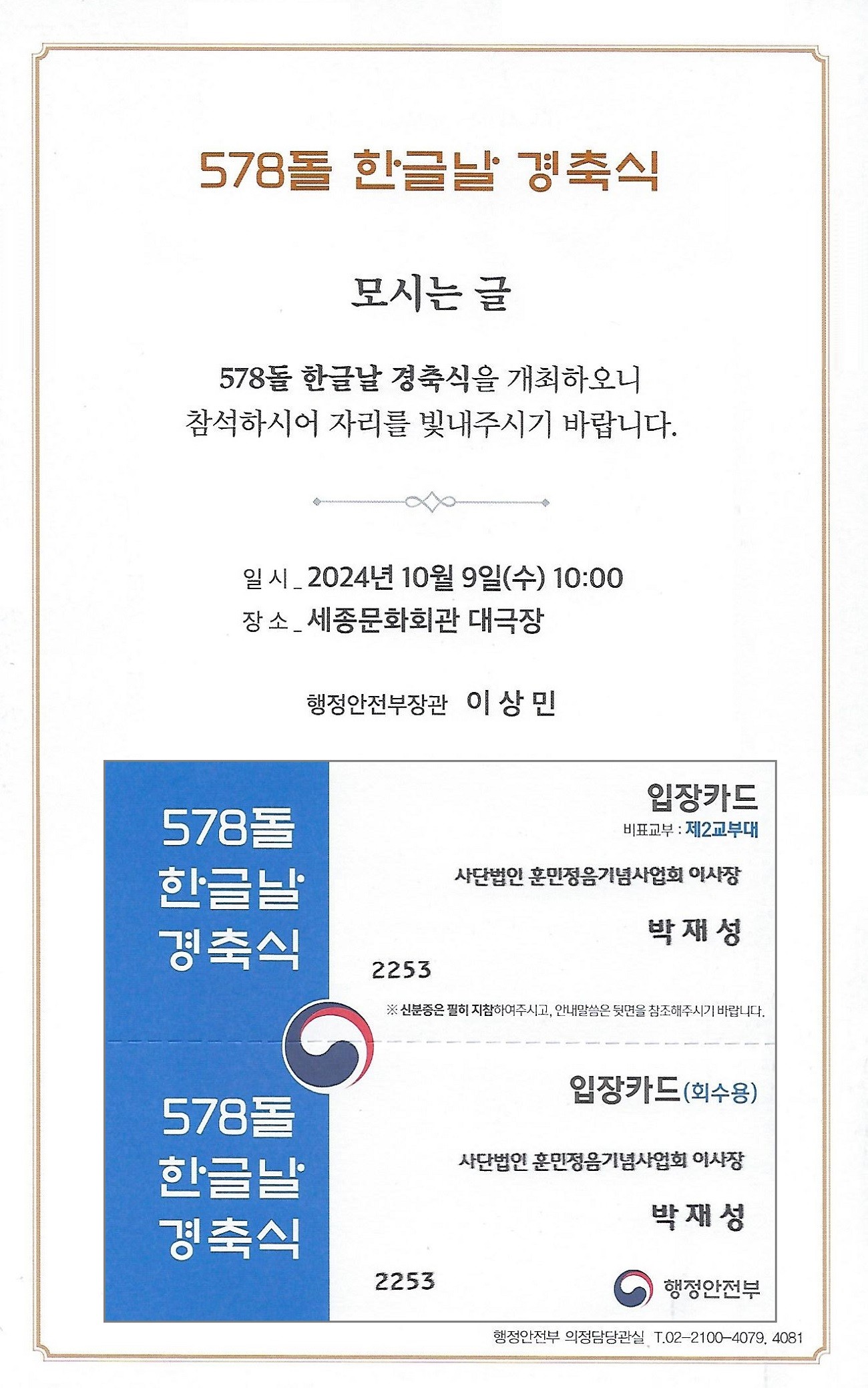 한글날 경축식 및 기관에서 초청 받은 박재성 이사장