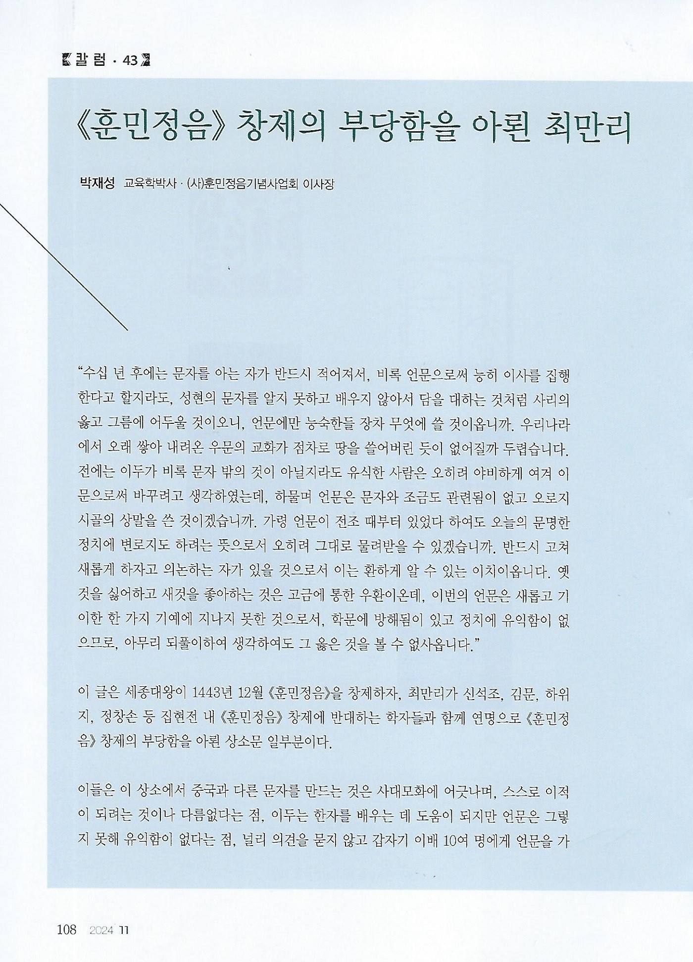 [월간서예문인화] <훈민정음> 창제의 부당함을 아뢴 최만리