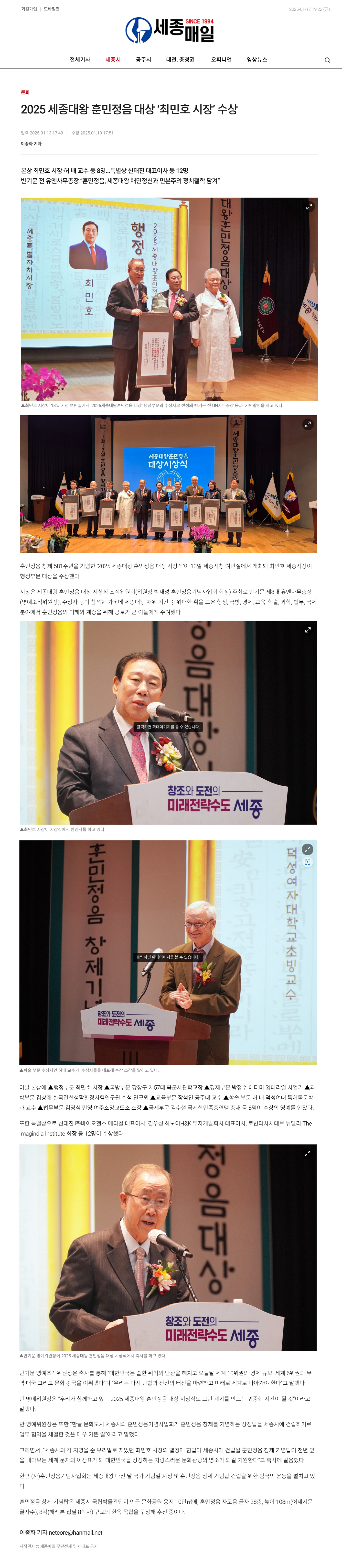 [세종매일] 2025 세종대왕 훈민정음 대상 '최민호 시장' 수상