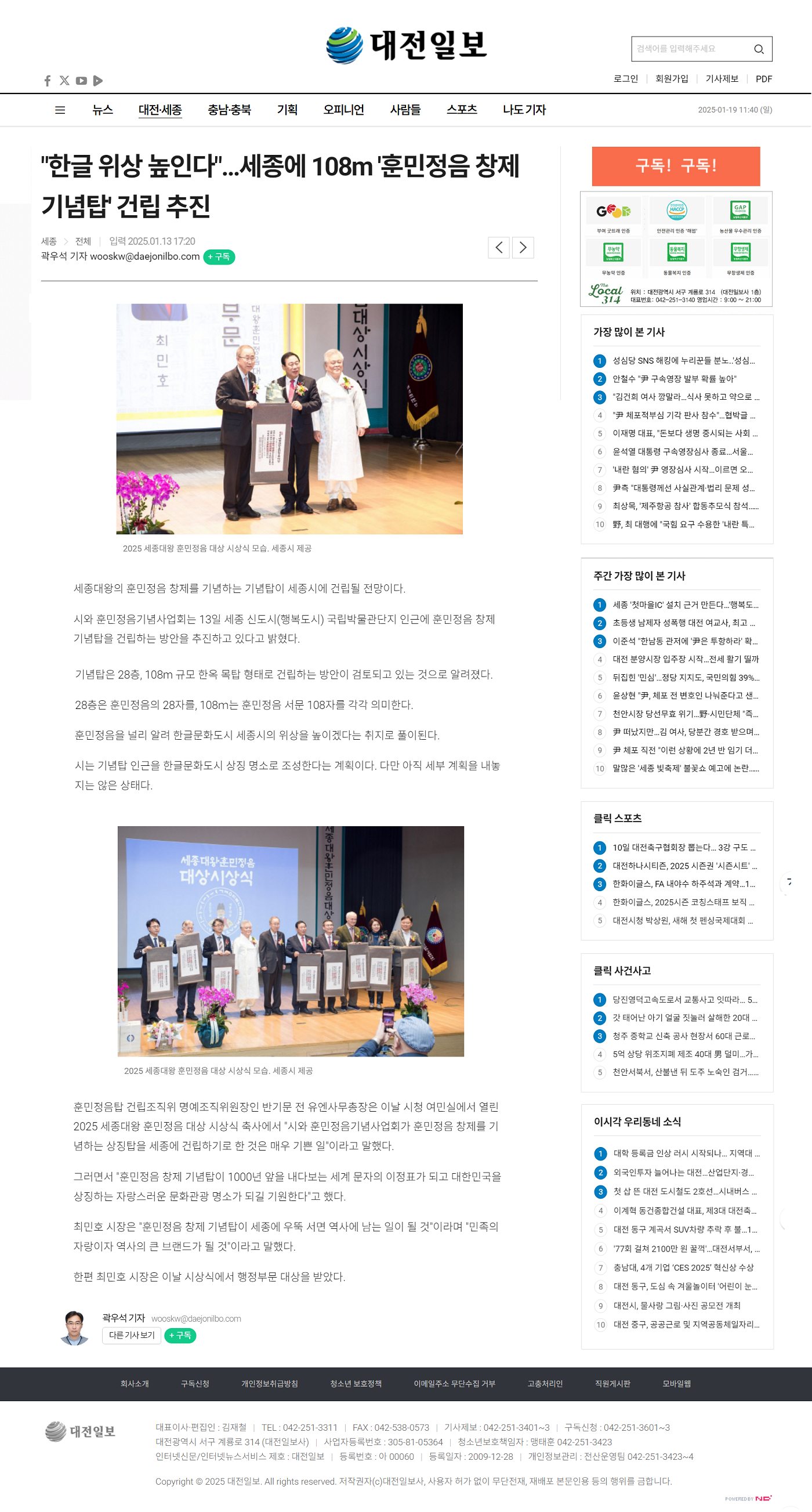 [대전일보] "한글 위상 높인다"...세종에 108m'훈민정음 창제 기념탑' 건립 추진