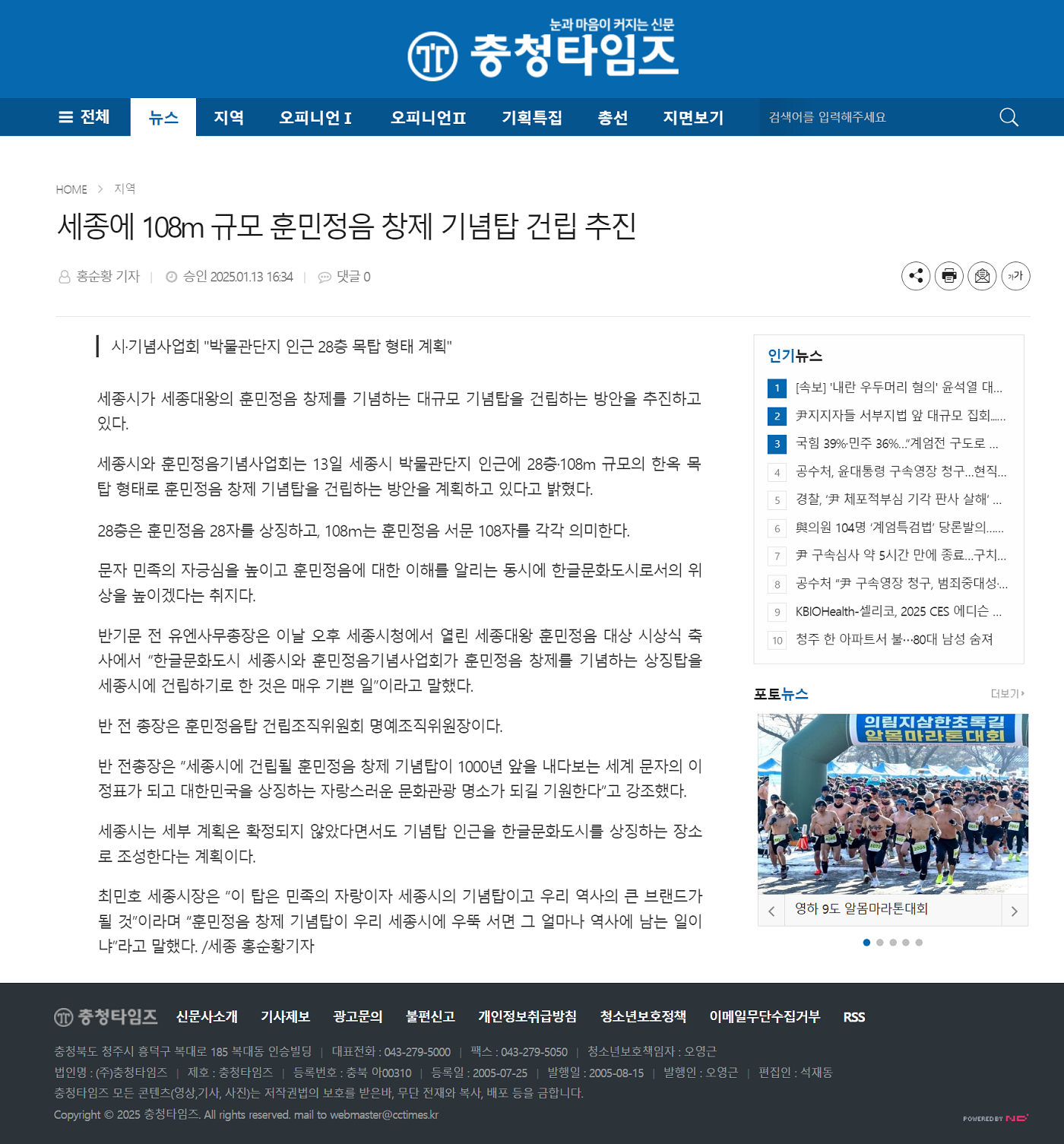 [충청타임즈] 세종에 108m 규모 훈민정음 창제 기념탑 건립 추진