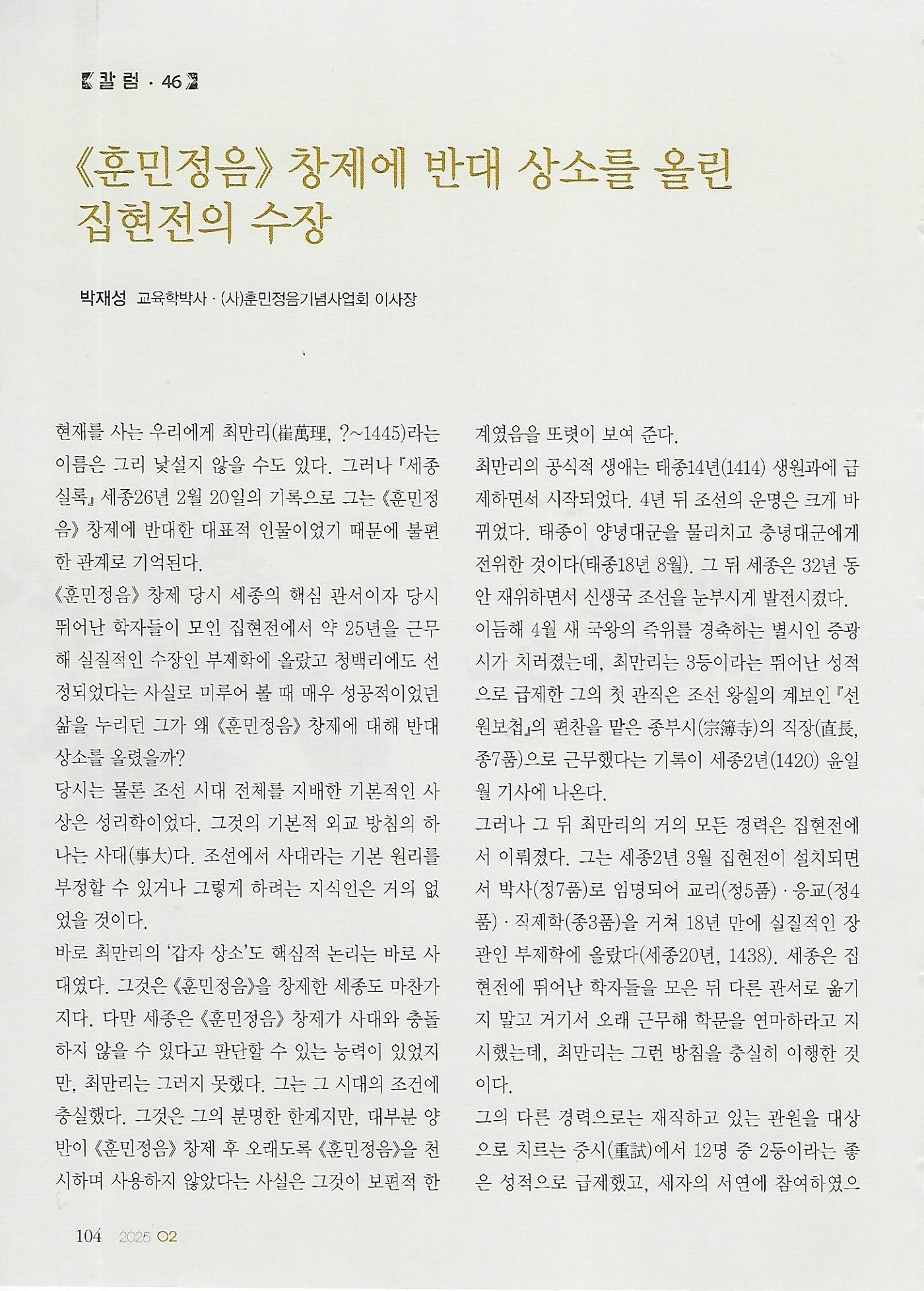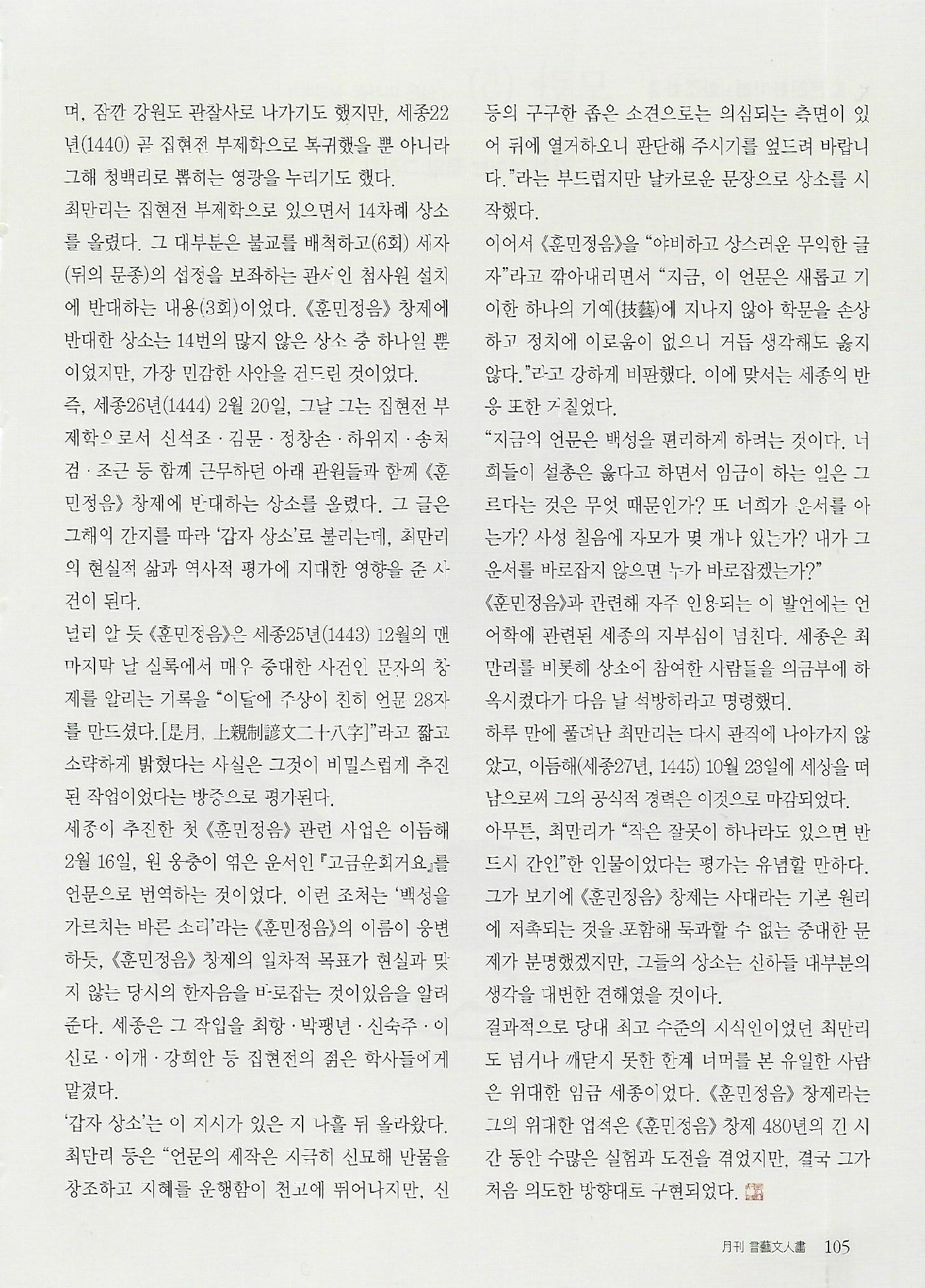 [월간서예문인화] '훈민정음' 창제에 반대 상소를 올린 집현전의 수장