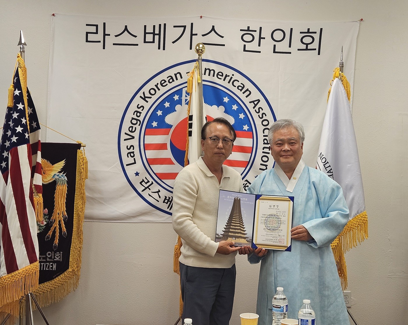 ▲ 김항호 라스베가스 한인회장에게 훈민정음탑건립조직위원회 해외건립공동추진위원장 임명장을 수여하는 훈정회 박재성 이사장
