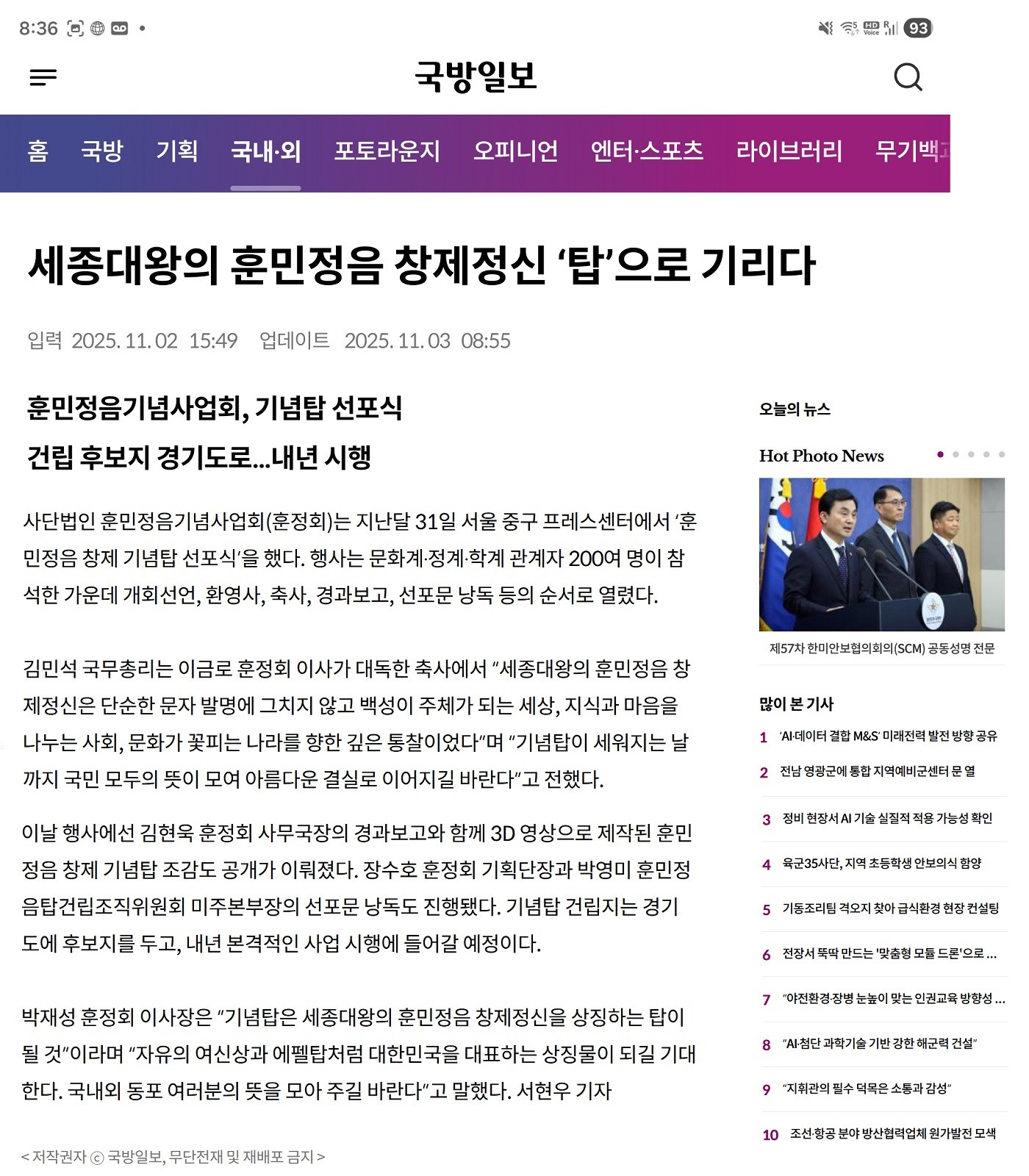 [국방일보]<인터넷판> 세종대왕의 훈민정음 창제정신 '탑'으로 기리다
