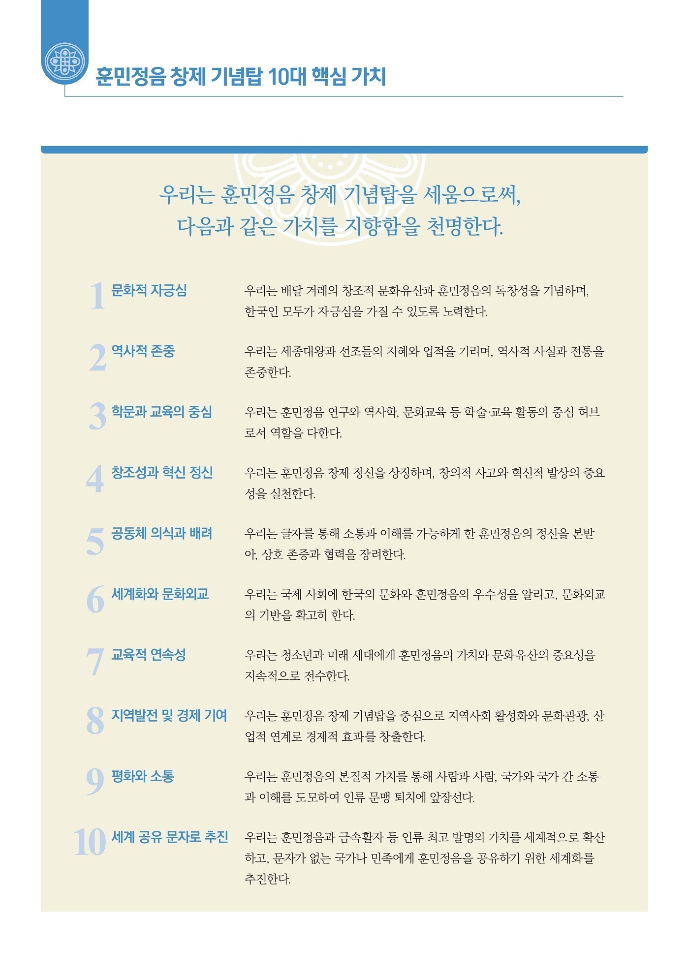 훈민정음 탑 10대 핵심 가치