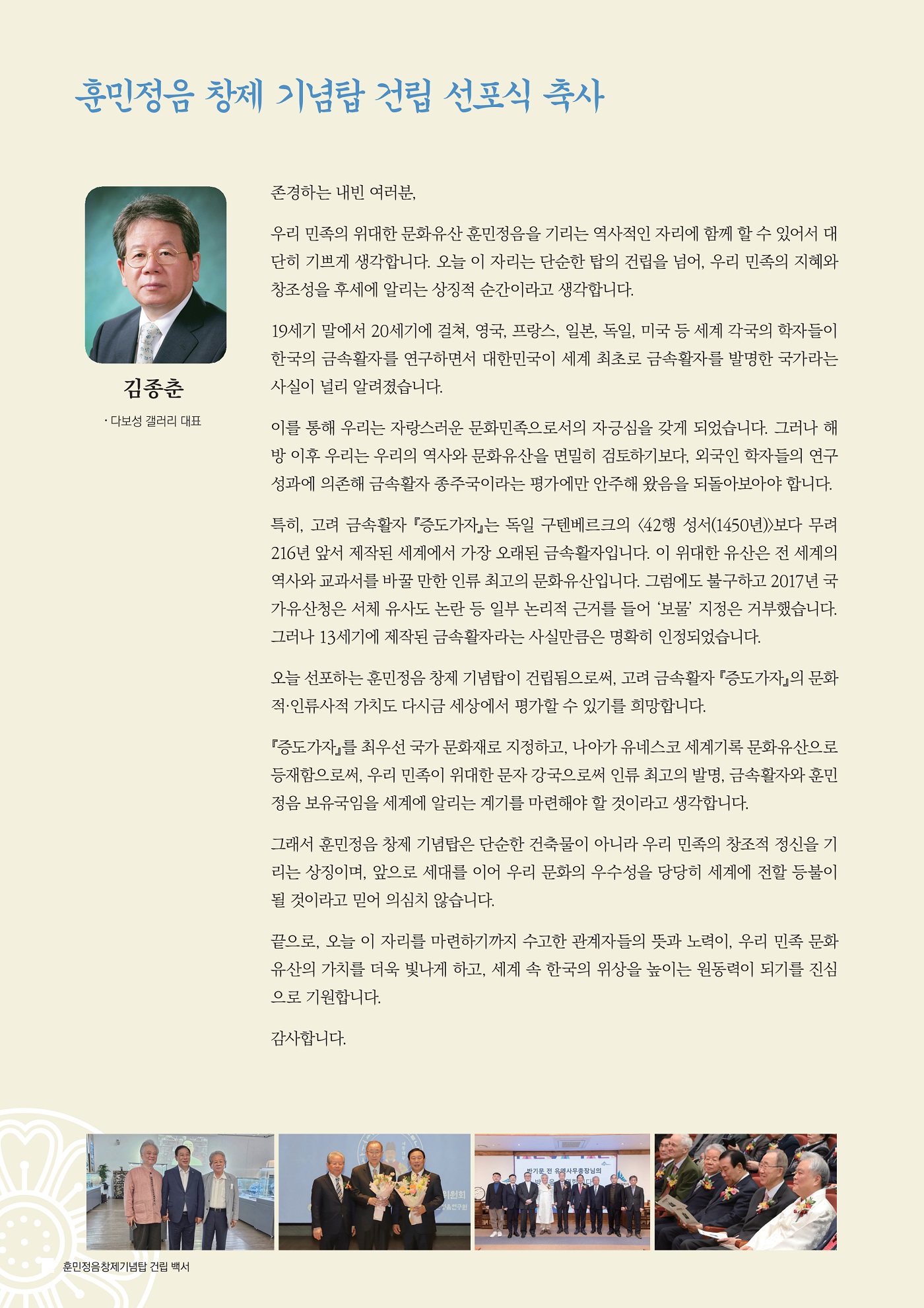 훈민정음 탑 건립 선포식 축사 - 김종춘