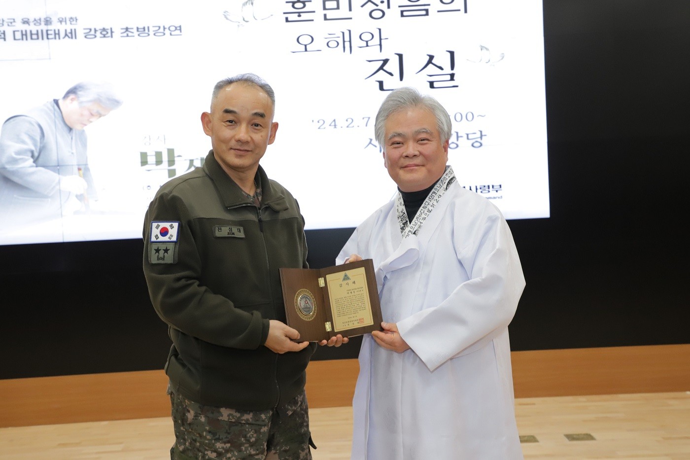 2024년 2월 7일, 박재성 이사장은 경기도 용인 소재 동원전력사령부 사령관 전성대 소장의 초청으로 부대를 방문하였다. 이날 영관급 이상 지휘관 및 군무원 70여 명을 대상으로 「훈민정음의 오해와 진실」을 주제로 90분간 특강을 진행하였으며, 감사패를 수여받았다. 또한 직접 휘호한 부대 구호 서예 작품이 사령부에 게시되었다.
