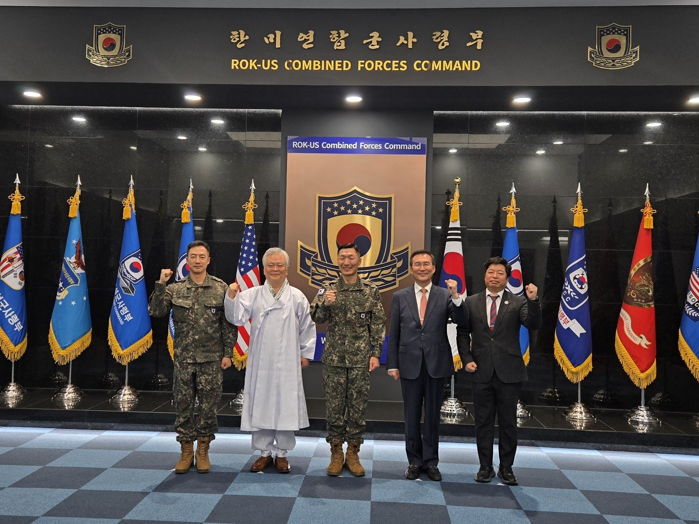 한미연합사령부 로고를 배경으로 부대 방문 기념 촬영(좌로부터 비서실장 한주열 대령, 김성민 대장, 박재성 이사장, 강창구 예비역 중장, 김연식 부이사장)